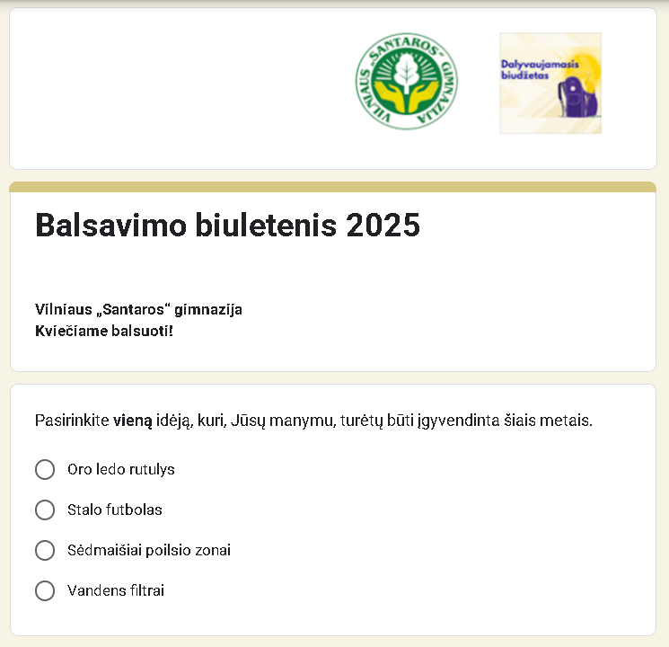 Šiemet dalyvaujamojo biudžeto projekte dalyvavo 5–8 klasių mokiniai. Mokiniai teikė idėjas, kurios pagerintų mokyklos aplinką, o daugiausia palaikymo sulaukė šios keturios: