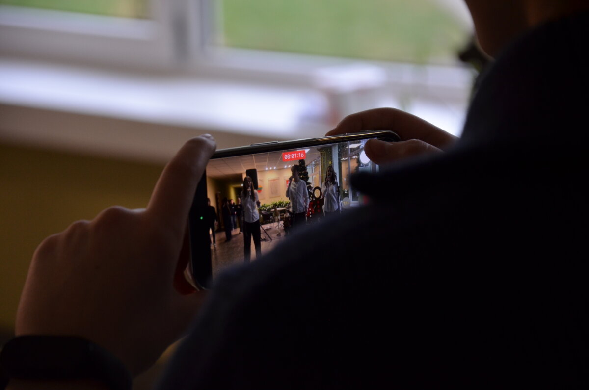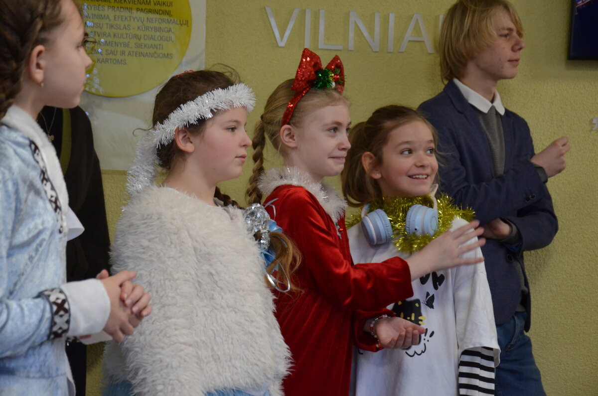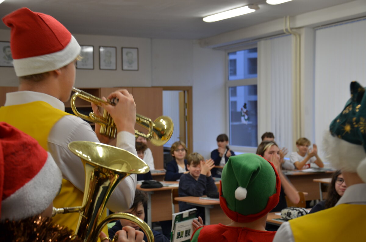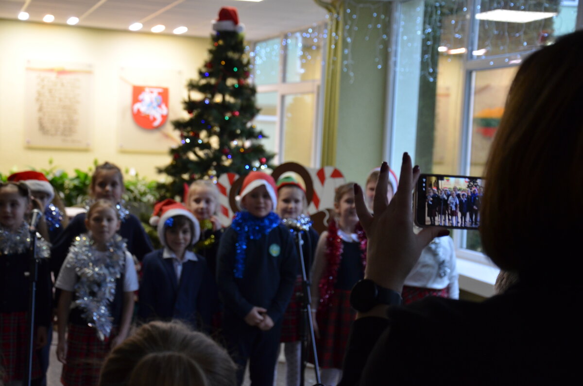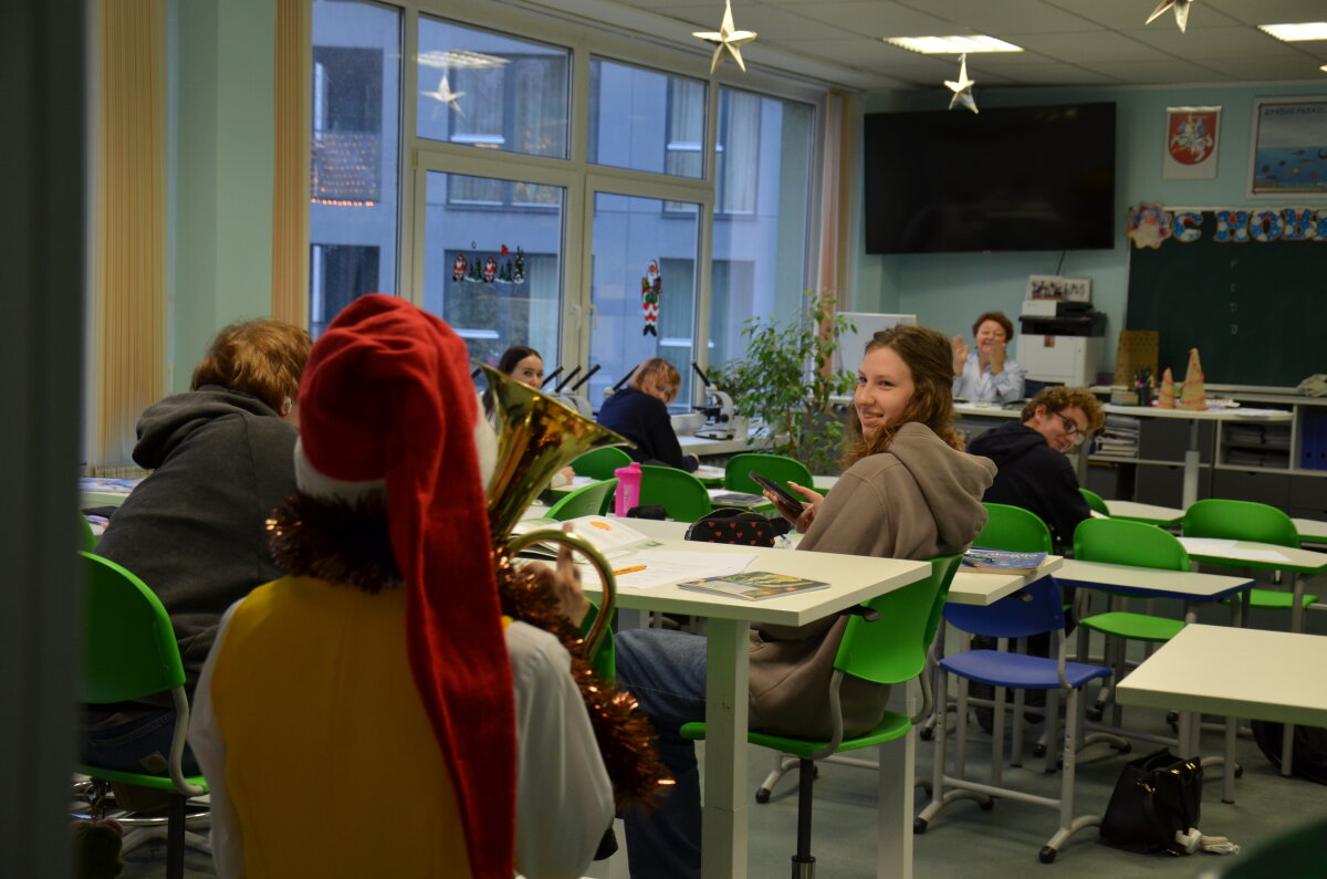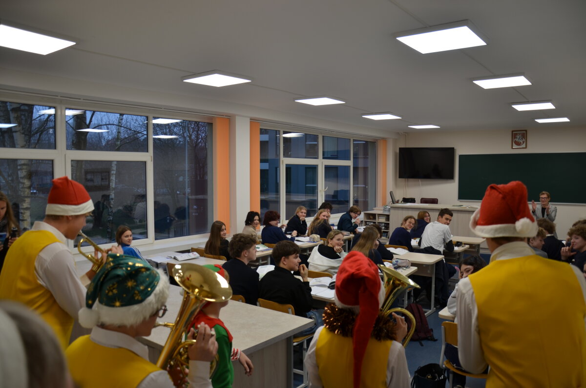 Per pertraukas gimnazijos koridoriai skambėjo vaikų juoku ir muzikos garsais – mokiniai džiaugsmingai šoko, dainavo ir grojo įvairiais instrumentais. Orkestras papildė šventinę nuotaiką, o kiti mokiniai aktyviai prisijungė prie muzikavimo, kuriant jaukią prieškalėdinę atmosferą.