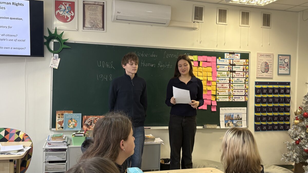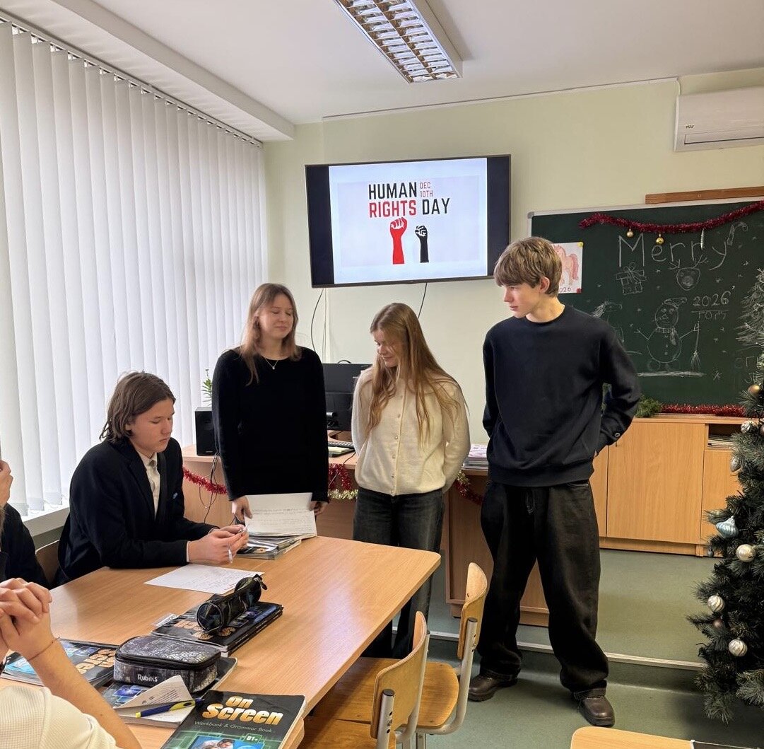 Gruodžio 10 d., minint Žmogaus teisių dieną, 10f klasės mokiniai – MEPA projekto dalyviai – dalyvavo įtraukiančioje ir apmąstyti skatinančioje pamokoje, skirtoje šiuolaikinės visuomenės iššūkiams nagrinėti. Dirbdami grupėse, mokiniai diskutavo apie realaus gyvenimo dilemas, kuriose susikerta teisės ir pareigos.