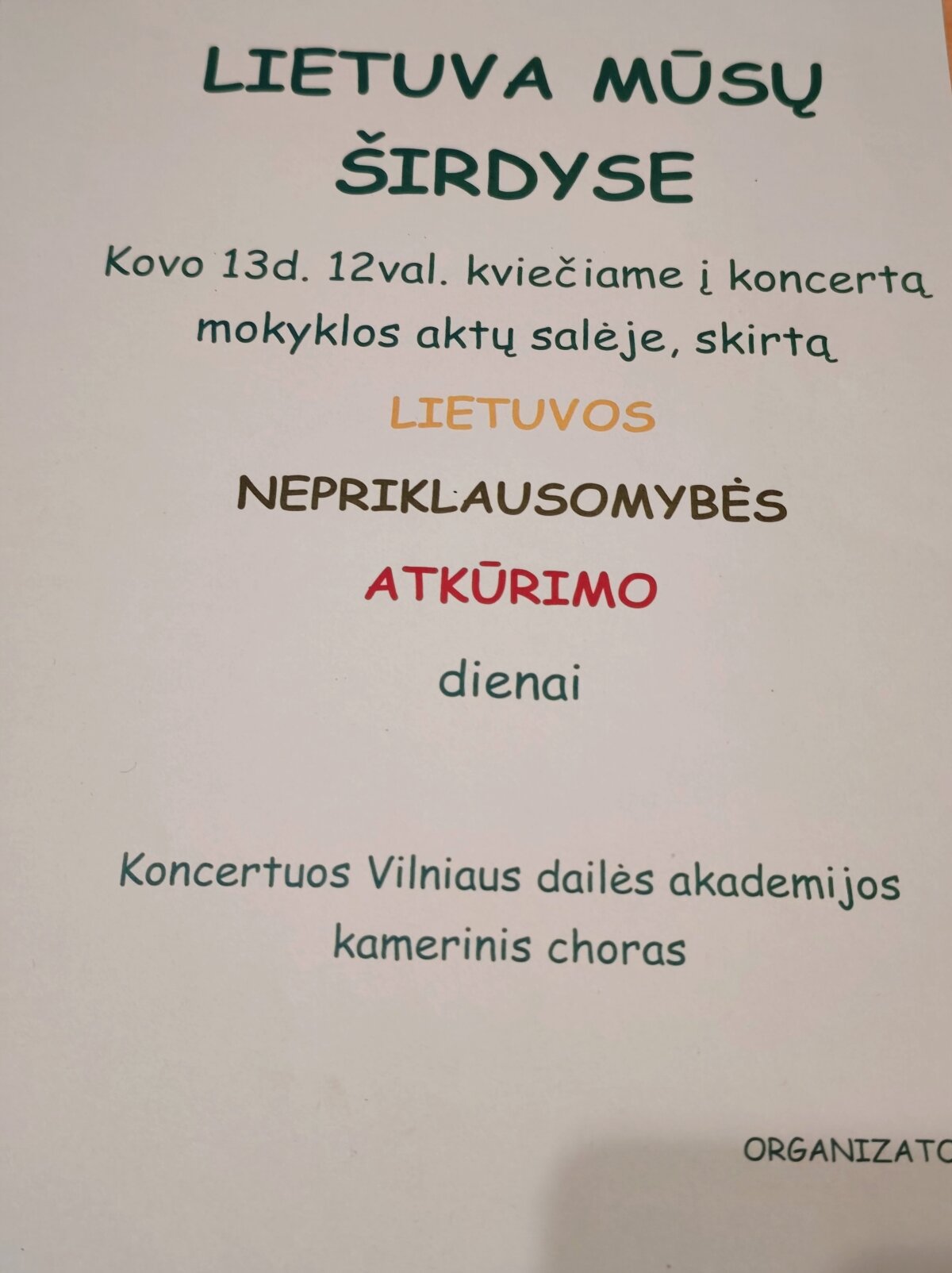 ,,Santaros“ gimnazijoje kovo 13 d. svečiavosi Vilniaus dailės akademijos kamerinis choras, kuris 10 ir 12 kl. moksleiviams dovanojo koncertą ,,Lietuva mūsų širdyse“, skirtą Lietuvos Nepriklausomybės atkūrimo dienai paminėti. Koncerto metu skambėjo ,,Lietuva brangi“, dainos iš Dainų šventės, studentų dainų ir šokių festivalio ,,Gaudeamus“. Ypač daug emocijų sukėlė dainos ,,Mano namai“ ir ,,Baltas paukštis“.